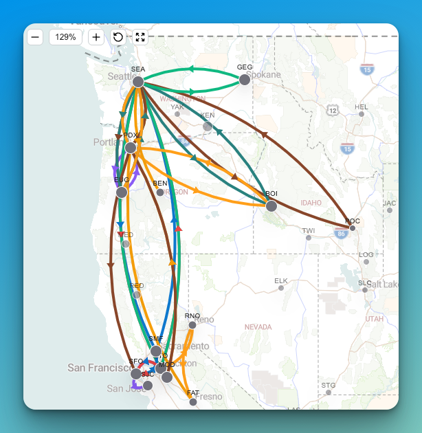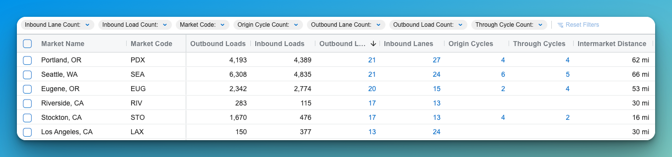 Shows the geographic relationships between markets and lanes. This view is useful for understanding regional freight flow and identifying network clusters.