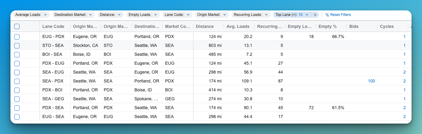 Lanes with higher recurring loads generally represent stable freight corridors, while lanes with higher empty percentages may indicate opportunities to improve network balance.