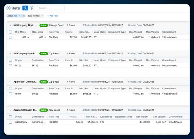 You can filter by Active, Rate Method, Company Name, or Expiration Date.