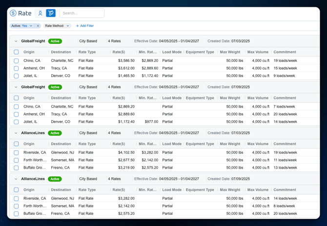 Rates are tied to specific origin and destination cities |